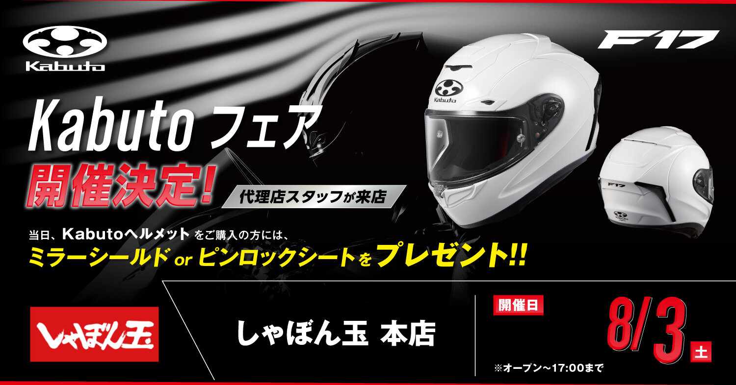 イベント開催期間中に、Kabutoヘルメットをご購入の方には、ミラーシールド or ピンロックシートをプレゼントいたします!Kabutoフェアだけのスペシャルプレゼントですので、この機会をお見逃しなく!