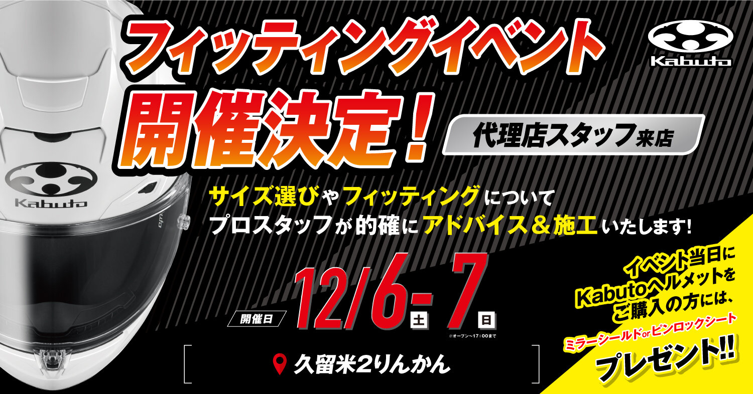 [代理店スタッフが来店!!]当日はKabutoブースにて、ニューモデルやニューカラーをご試着いただけるほか、ヘルメットについての質問や疑問、フィッティングのアドバイスについてお答えいたします。 イベント開催期間中に、Kabutoヘルメットをご購入の方には、ミラーシールド or ピンロックシートをプレゼントいたします!当日だけのスペシャルプレゼントですので、この機会をお見逃しなく!