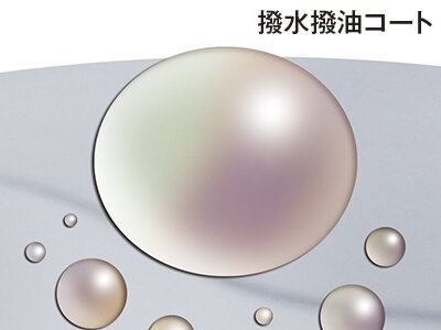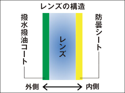 外面に水と油の両方をはじく撥水撥油コーティング、内面に防曇シートを装備。防汚性能と防曇性能の両方を兼ね備えた高機能レンズです。