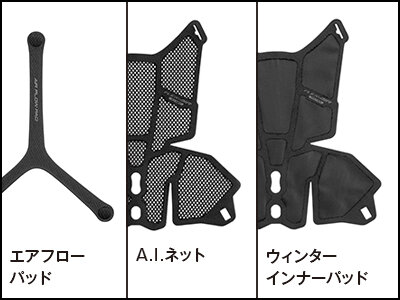 頭部からヘルメットを浮かせてエアルートを確保するフローティング構造と、Y字形状により接触面積を減らし通気性向上に貢献する「エアフローパッド」を搭載。