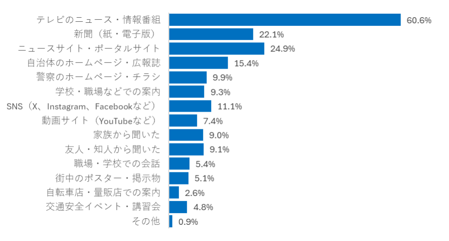 「青切符適用について、あなたに最も近いものを教えてください。」に対し、「具体的な違反内容や反則金額まで把握している」14.3%、「具体的な違反内容は把握している(反則金額までは知らない)」33.2%で、具体的な違反内容を把握しているのは47.5%でした。制度開始の認知は92%と高く、情報源はテレビのニュース・情報番組などメディアが上位を占めました。