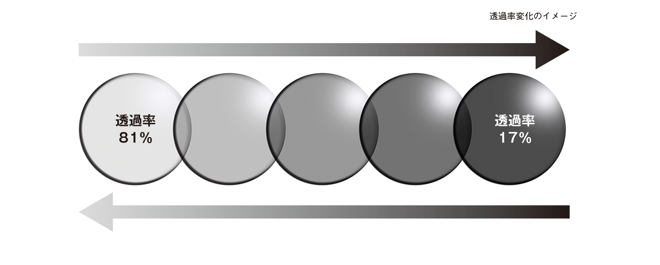 (ご注意)使用環境により調光濃度や調光スピードが異なります。また経年劣化により、色変化しにくくなる特性があります。