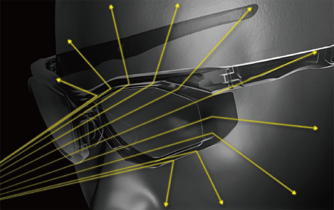 301シリーズのDOCKは、フレームカーブに沿ってサイドまで覆われるデザインが特徴。光の侵入をブロックし、眼への負担を軽減するようにデザインされています。