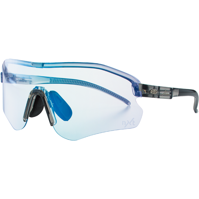 NXT素材は超軽量防弾プロテクター開発プロジェクトから生まれた素材であり、ポリカーボネートを超える軽量さ、耐衝撃性、耐久性を持ちます。この特性を活かして強度基準を十分にクリアしながら、従来比でレンズの厚さを大幅に軽減することができました。また、レンズ内面には映り込みや眩しさを抑える乱反射防止コート(ARコート)を採用しています。