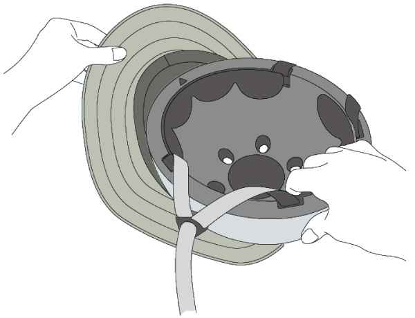 ヘルメット本体前部の△マークと帽子の刺繍糸の印を合わせ、指で押さえて、帽子全体をヘルメット本体に覆い被せてご使用ください。
