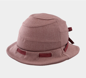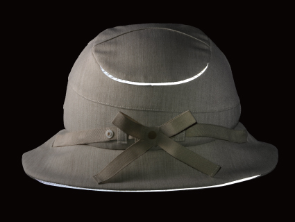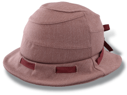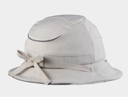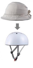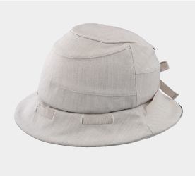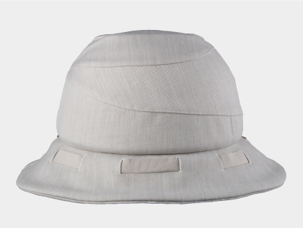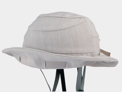 国内データに基づく頭部形状に合った、快適な被り心地の軽量コンパクト・ソフトシェル帽体に、パターンにこだわった立体感のあるエレガントなデザインの帽子(ヘルメットカバー)を装着。またリボンを使ったツバの跳ね上げ機能で、走行時のばたつきを抑え、視認性を確保しています。(特許出願中)