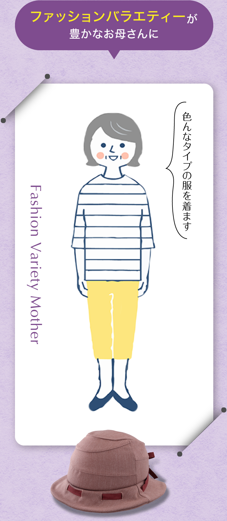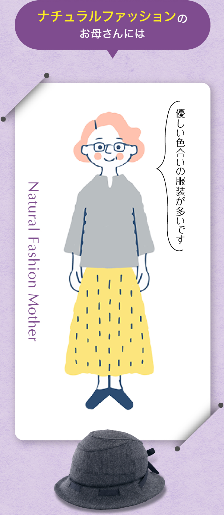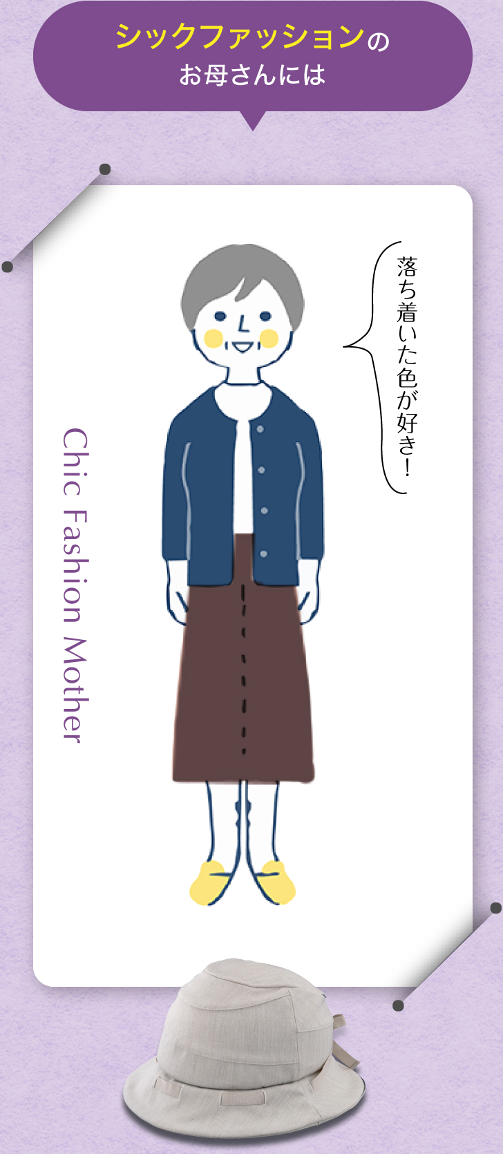 広めのツバで気になる日差しもしっかりガード。お母さんが喜ぶエレガントなデザインです。