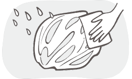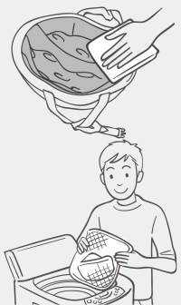 洗面器などに水もしくはぬるま湯※をため、あごひもをそこに浸します。あごひもに水分を含んだら、シャンプーもしくはボディソープを数滴手に取り、優しくもみ洗いを行い汚れを落とします。泡が無くなるまでしっかりすすぎ洗いをしたら、タオルなどであごひも全体を包み込みながら水分を取り除き、風通しのよい日陰で十分に乾燥させてください。 |