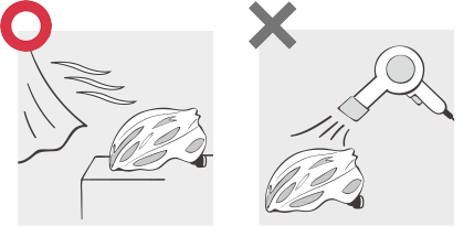 | ヘルメット本体もインナーパッドも、直射日光が当たらない、風通しのよい日陰などでしっかりと乾燥させましょう。もちろん風などで落下しないよう、安定した場所での乾燥をしましょう。なおドライヤーや浴場乾燥、暖房機など50℃以上になるような器具や場所での乾燥は材質が傷むおそれがあるので絶対におやめください。しっかり乾燥されず保管した場合、材質が劣化する場合があります。 |