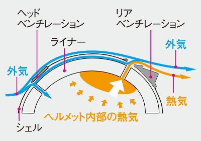 走行時、前方からの風圧を利用しながら効率よく外気を導入し、ヘルメット内部の熱気を排出させるシステムです。